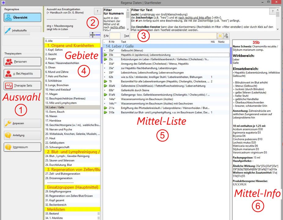 Ein grüner Pfeil zeigt an, daß das Mittel in diesem Gebiet Hauptmittel ist.Der Text der Zeile (Mittelbescheibung/-Einsatz) ist aus dem Regenaplex Handbuch von Dr. Götz Blome, Wenn eine Zeile gewählt wird, dann erscheint die zugehörige Mittelbeschreibung mit den Einsatzgebieten im voreingestellten Bereich.