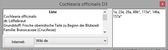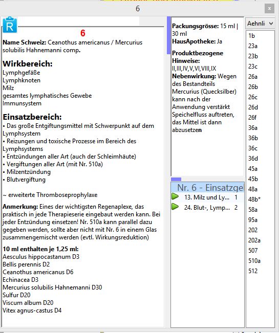 Im linken Teil des Infofensters ist eine Liste der enthaltenen hom. Einzelmittel zu sehen.