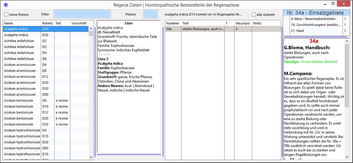 Wird "alle Gebiete" gewählt, dann sind hier alle Einsatzgebiete der in der mittleren Liste aufgeführten Regenaplexe zu finden.Es ist also das Einsatzspektrum eines Inhaltsstoffes im System der Regenaplexe zu sehen. Das kann auch für das Finden von sich ergänzenden Mittel oder Alternativen hilfreich sein.