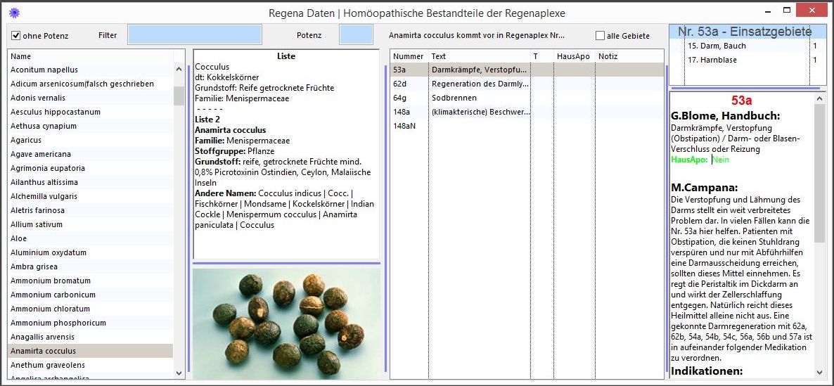 Anzeige der Mittel, in denen der gewählte Inhaltsstoff vorkommt.Für das ausgewählte Regenaplex-Mittel werden rechts daneben die Einsatzgebiete nach Dr. Blome und darunter die vorhandene Mittelbeschreibung angezeigt.